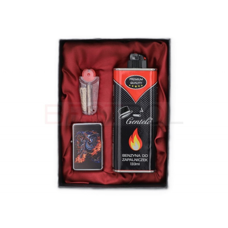 W skład zestawu wchodzą zapalniczka benzynowa, benzyna GENTELO oraz zapasowe kamienie i knoty.